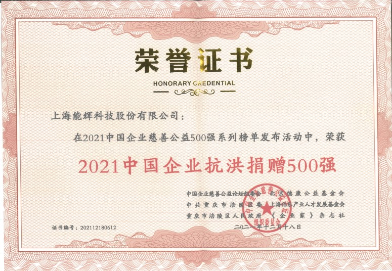 上海能辉科技股份有限公司获2021中国企业抗洪捐赠500强