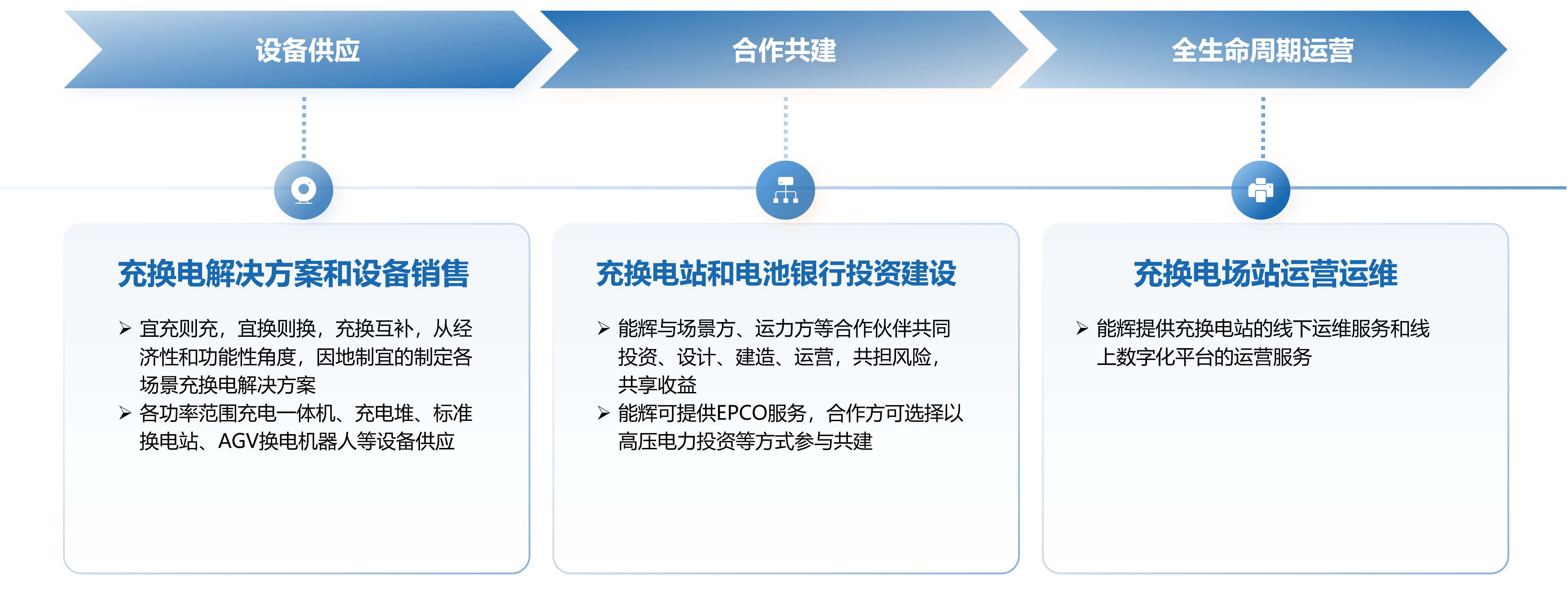 上海能辉提供“设备供应+合作共建+全生命周期运营”的多元化服务,在商用车充换电领域,为合作方进一步赋能